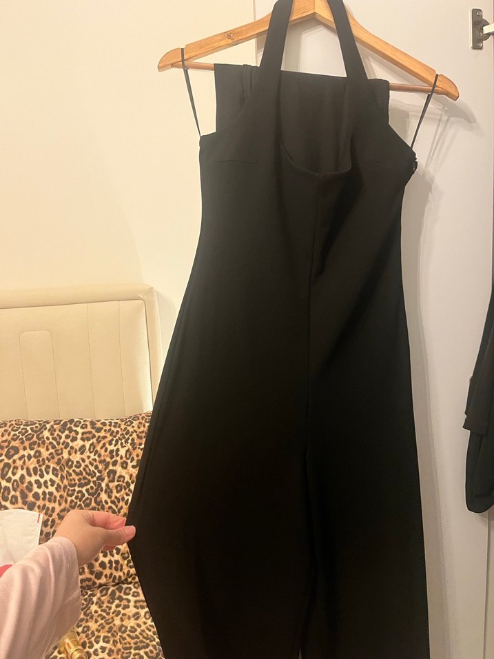 Zara siyah halter yaka boyından tulum s beden etiketi yok ama hiç giyilmedi. Bu siyah, skadın tulum, ipeksi kumaşıyla gotik ve minimalist tarzı yansıtır. Romantik akşamlar için ideal.