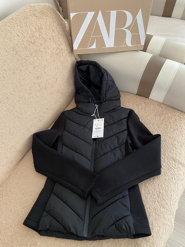 ZARA markalı siyah, fermuarlı, yüksek yakalı ve uzun kollu, normal boyda, dar kesim kadın ceketi. Outdoor ve sokak stili için uygundur.