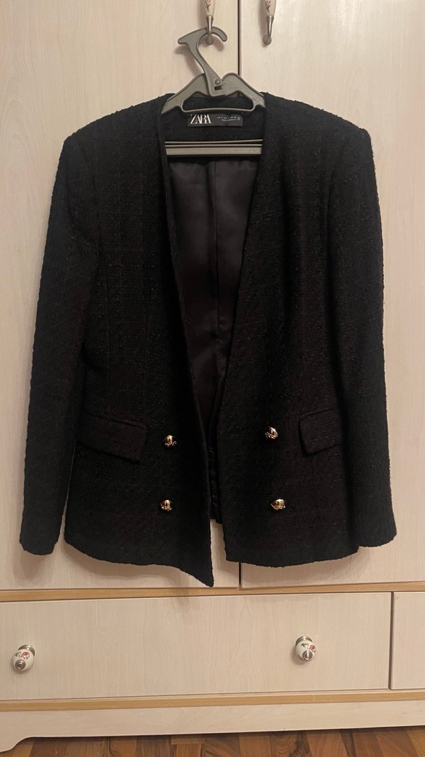 Zara marka siyah kadın blazer ceket, düğmeli ve kesimli yaka detaylıdır. Uzun kollu, midi boy ve düzenli kesimdir. Ofis ve günlük kullanıma uygundur. Tüvit kumaş