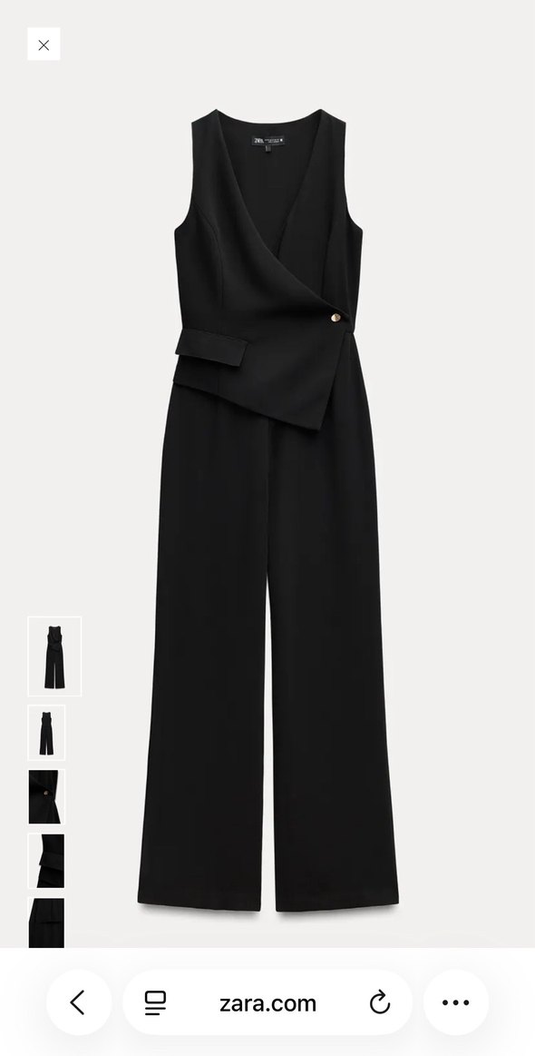 Siyah, kolsuz tulum, yakasında kesik yaka detayı bulunur. İpek gibi kumaşı ve uzun paçalarıyla ofis için uygundur.