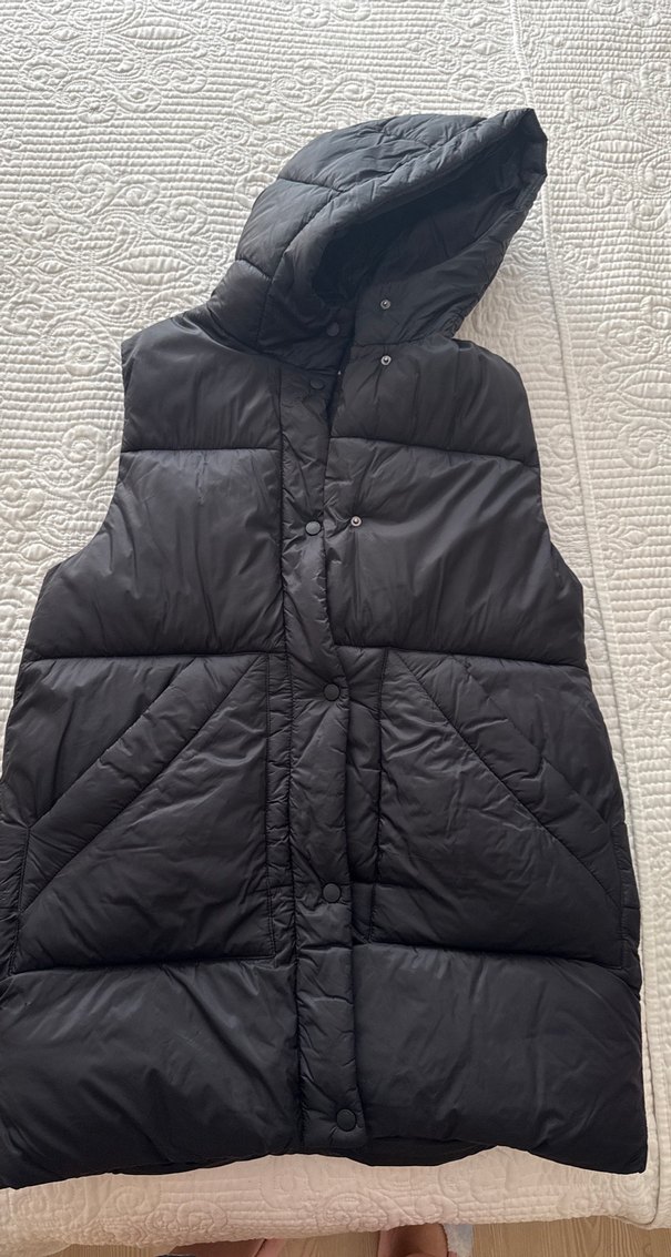13-14 yaş ama S beden uyumlu kalça örten.Siyah, düğmeli, kapüşonlu ve yüksek yakalı, sentetik kumaştan yapılmış kadın yelek. Günlük rahat sokak stili için uygundur.