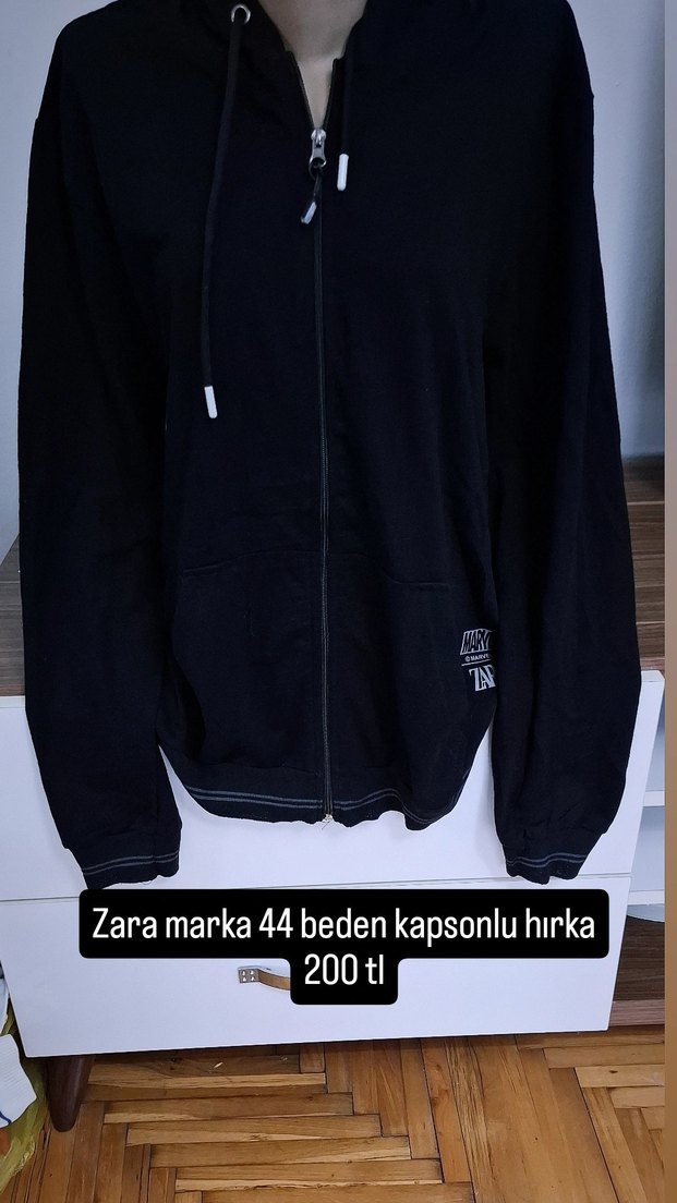 Zara marka siyah kapüşonlu, fermuarlı hırka, yumuşak ve sıcak kumaştan, bol kesim, uzun kollu ve yuvarlak yaka, günlük rahat kullanım için uygun.