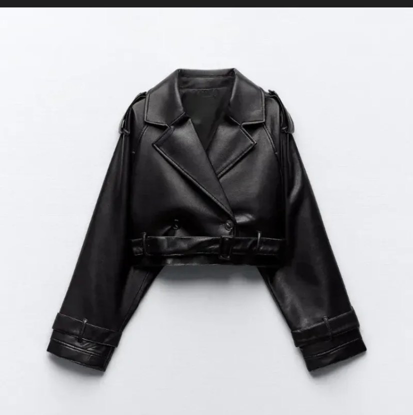 Zara siyah deri ceket, kısa kesim, kemerli ve notlu yakalıdır. Bol kesim ve askılı kollara sahiptir, sokak stiline uygundur. Kollarında hafif soyulmalar var bu yüzden fiyatı uygun koydum çok az içte ✨