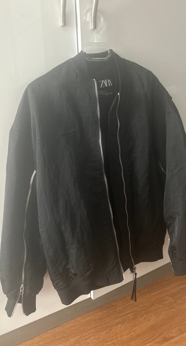 Zara keten siyah ceket, uzun kollu ve fermuarlı, midi boyda, bol kesim ve yuvarlak yaka ile günlük sokak stiline uygundur.