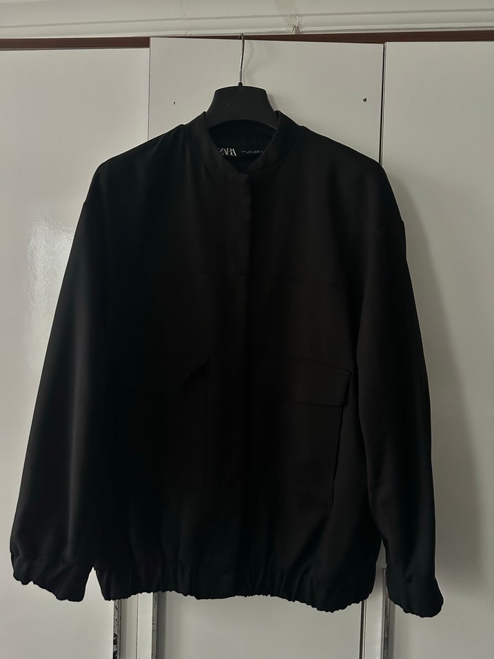 Siyah keten kumaştan, bol kesim ve uzun kollu, yüksek yakalı kadın ceket. Minimalist ve avant-garde tarzıyla günlük kullanıma uygun, desen içermeyen şık bir model.