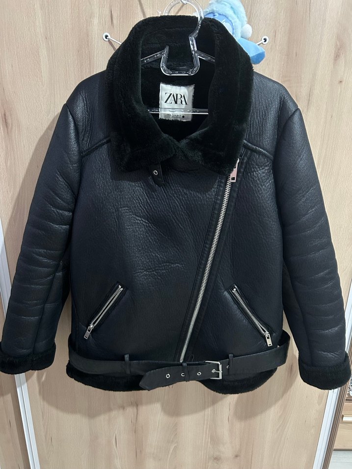 Siyah deri, kürklü detaylı biker ceket. Fıt kesim, yakalı, kayışlı kollar ve midi boy. Fermuarlı cepler ve kemer bulunur. Rahat ve şık günlük kullanım için. Zara marka az kullanıldı sorunu yok