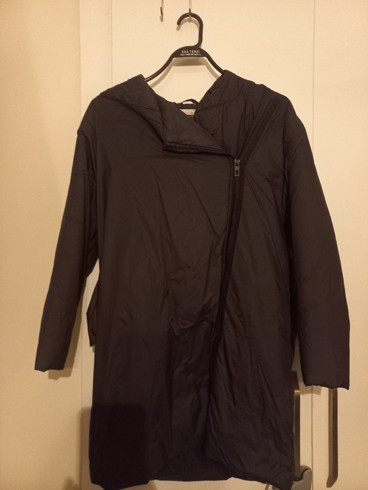 Siyah midi uzunlukta, yüksek yakalı ve dökümlü tasarımlı çocuk mont.Su geçirmez,bol kesim ve uzun kollu, sokak modasına uygun. 13 yaşa kadar uygundur.