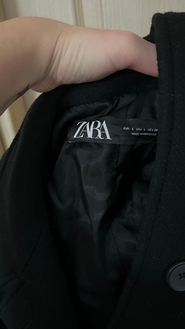 Zara'nın siyah, fitted kesim midi kabanı, kesik yakası ve fermuarlı tasarımıyla dikkat çekiyor. Sentetik kumaştan, günlük ve sokak tarzına uygun. İki göğüs arası 60 cm Boy 110 cm