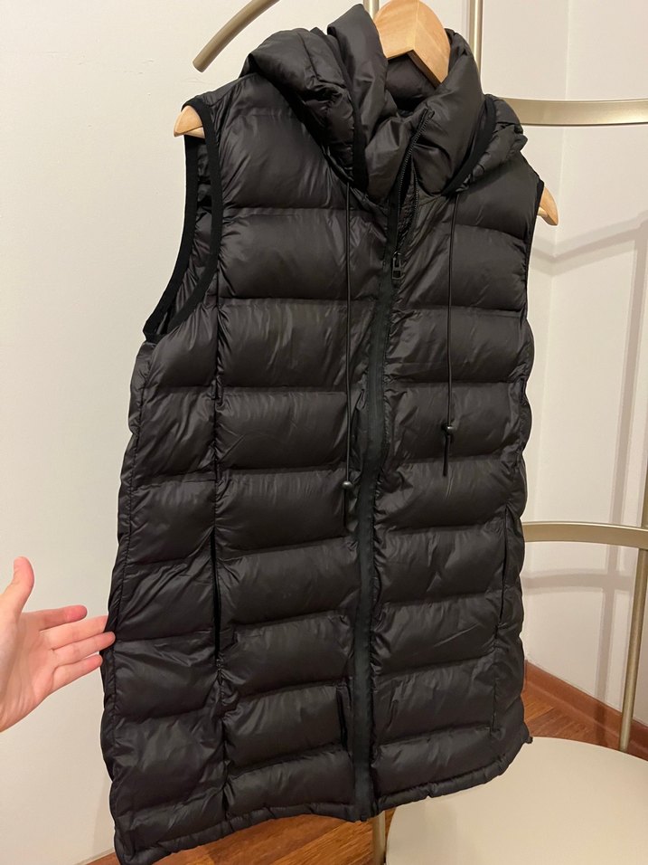 siyah, kolsuz şişme yelek, yüksek yakalı ve fermuarlı, boyu mididir kalçayı kapatır. Günlük kullanıma uygun, rahat ve vücuda oturan kesim. 36-38 bedene uygun az kullanıldı yeni gibi
