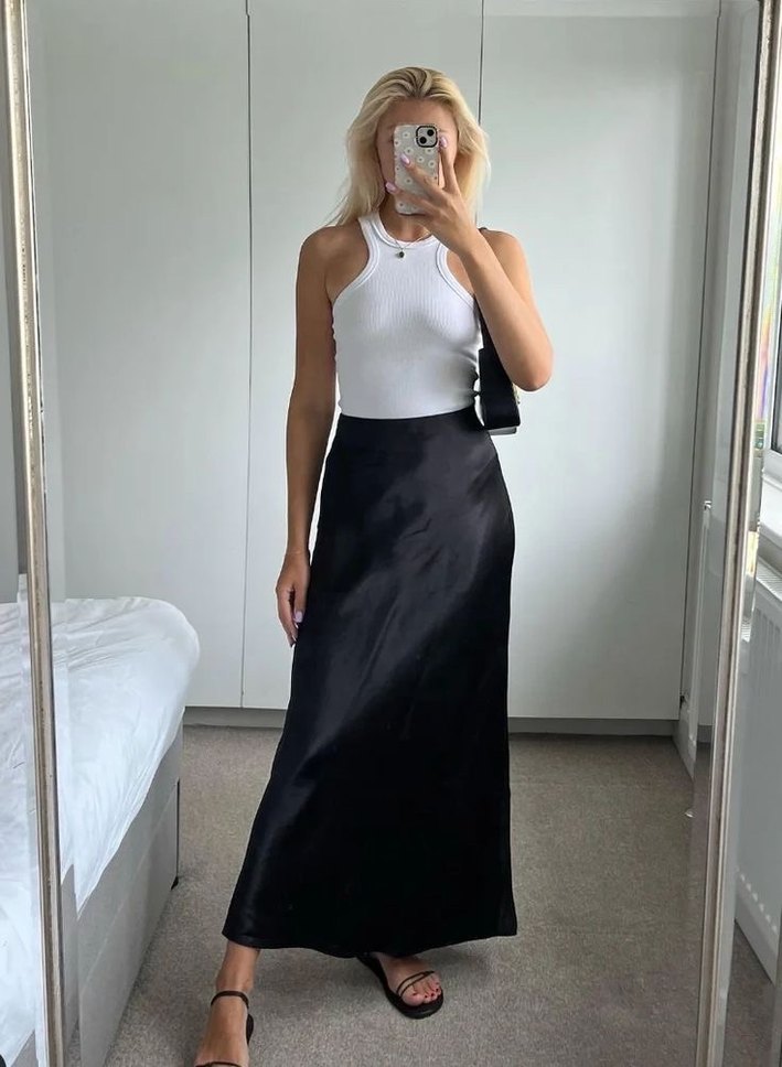 Siyah, ipeksi dokulu, vücuda oturan midi uzunlukta kadın eteği, gündelik rahat sokak stili için ideal.