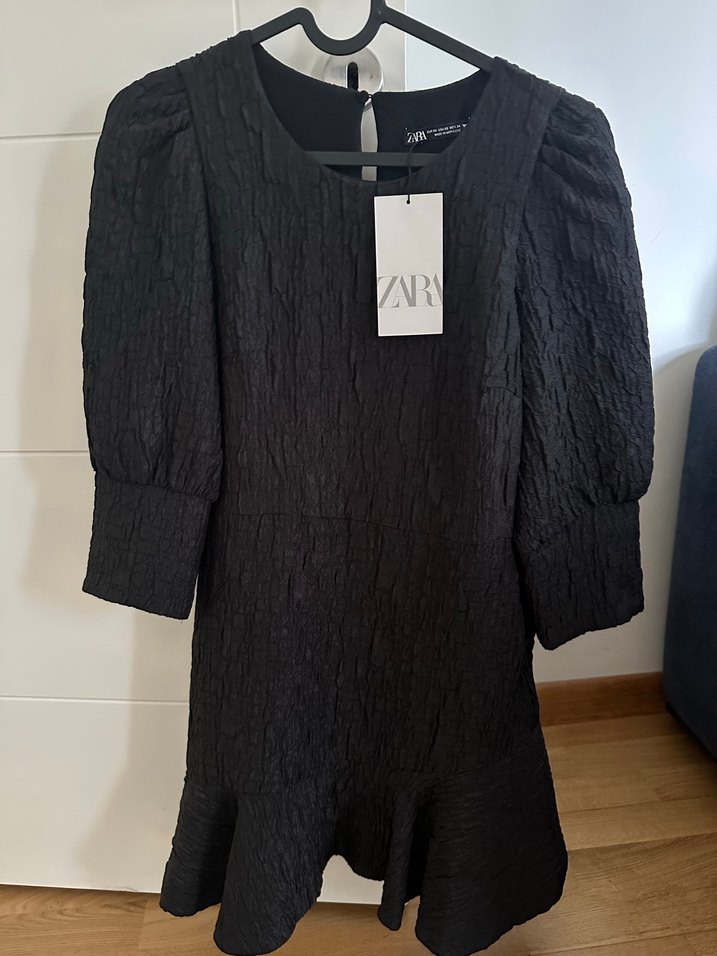Zara siyah mini elbise, uzun kollu ve yuvarlak yakalıdır. Fırfırlı etek ucu ve dokulu kumaşıyla rahat ve salaş bir görünüme sahiptir. Günlük kullanıma uygundur.