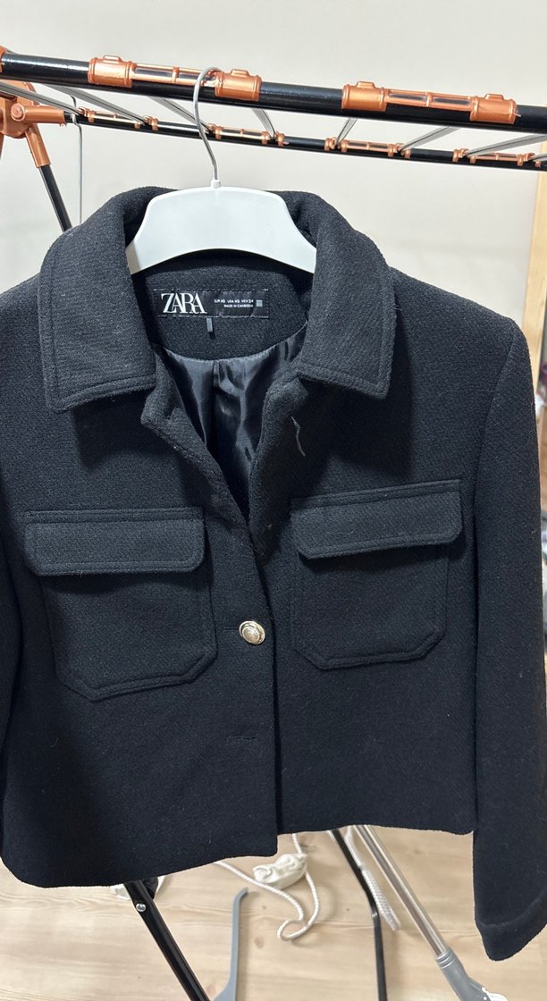 Zara kadın kaban, düğmeli ön, uzun kollu ve keskin yaka detaylıdır. Rahat kesim ve kısa boyda, yumuşak ve sıcak kumaştan üretilmiştir.