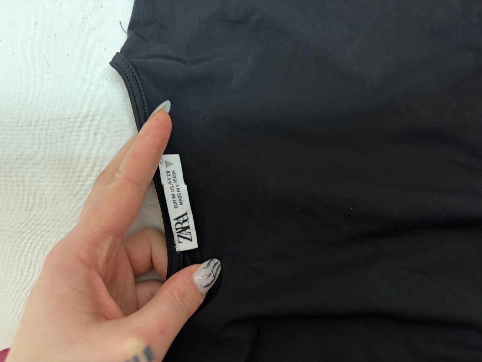 Zara markasına ait siyah mini boyda, baskılı desenli ve minimalist tarzda street wear büstiyer. Kısa kesimiyle rahat kullanım sağlar.