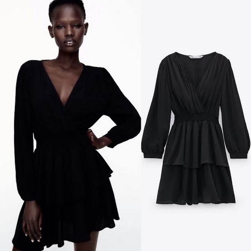 Zara Siyah Mini V Yakalı Katlı Elbise