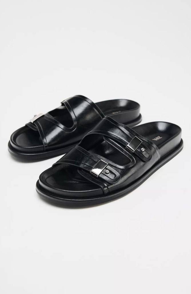 Siyah parlak tokalı kayışları olan, kauçuk malzemeden yapılmış kadın terlik. Minimalist ve sokak stili, günlük kullanım için uygun. Zara Siyah Parlak Tokalı Suni Deri Kadın Terlik