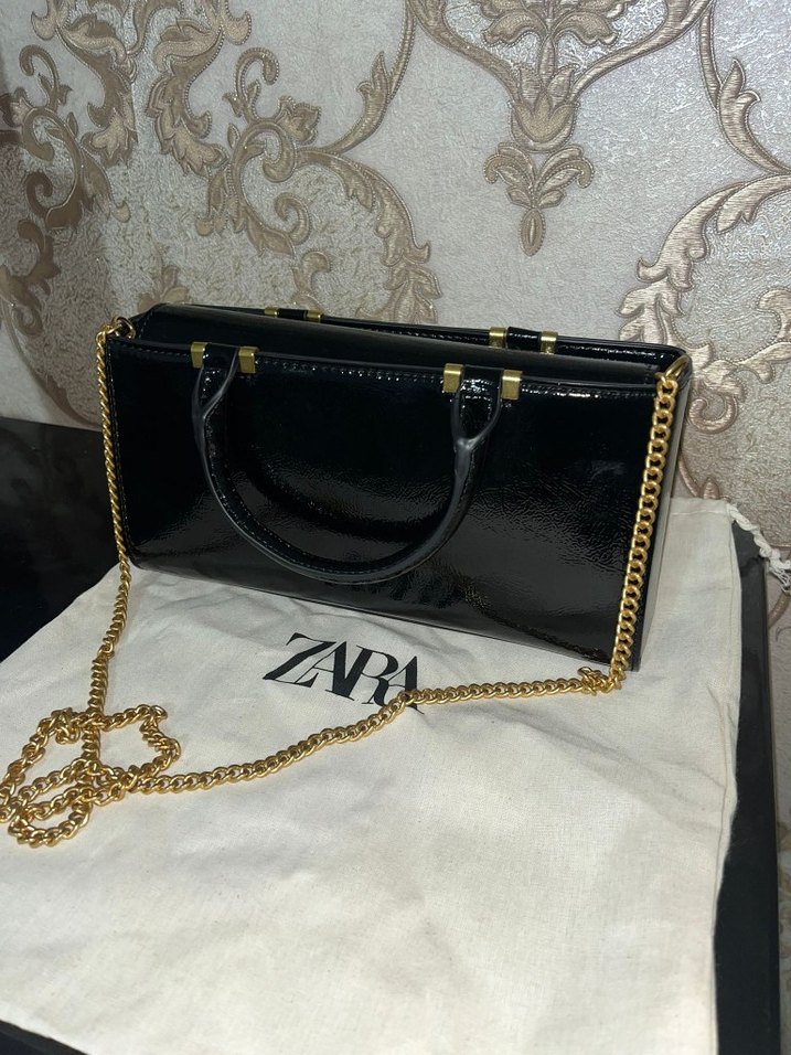 Zara siyah parlak yılan desenli deri çanta, zincir detaylarıyla klasik şıklığı sokak tarzıyla buluşturuyor. Günlük kullanım için ideal. hiç kullanılmadı.