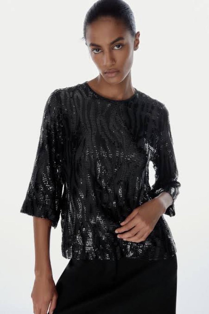 Zara Siyah Payetli Zebra Desenli Kadın Bluz