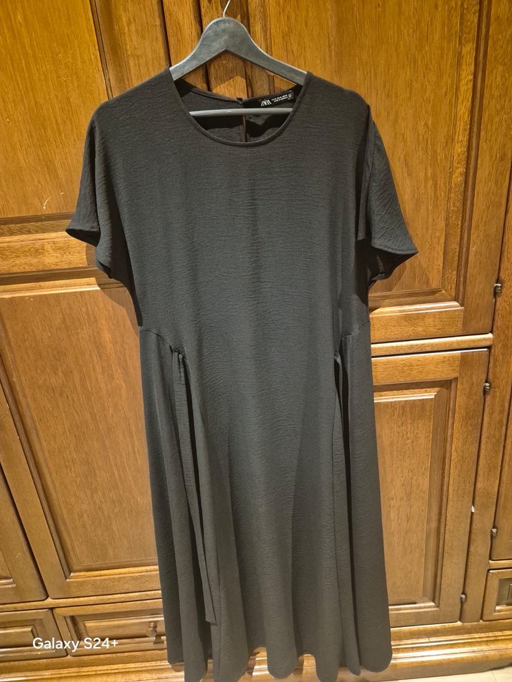 kısa kollu, yuvarlak yakalı, piliseli detaylara sahip siyah uzun elbise, minimalist sokak stili için uygundur.