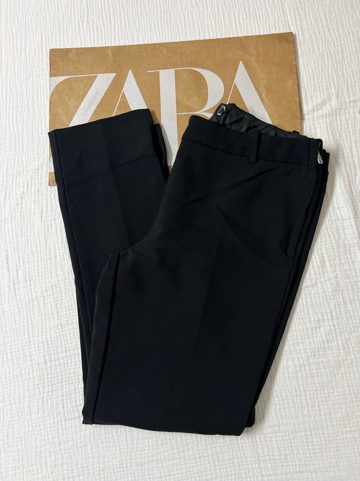 Siyah renkli, regular fit kesime sahip Zara kumaş pantolon. Sentetik kumaştan üretilmiş, fermuarlı detaylarıyla ofis ve günlük kullanıma uygundur.