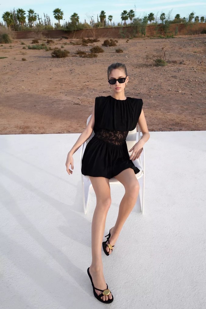 Yeni etiketli Zara Siyah renkli, bisiklet yaka, kolsuz ve pileli elbise. Aynı renkte kroşe aplikeli detaylı