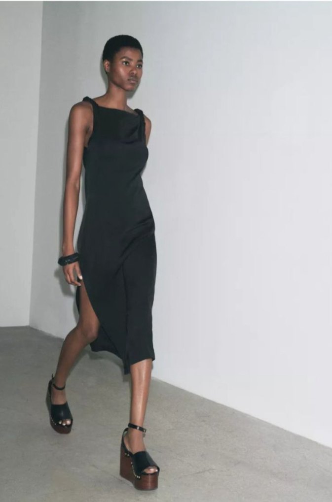 Zara Siyah saten yırtmaçlı midi elbise
