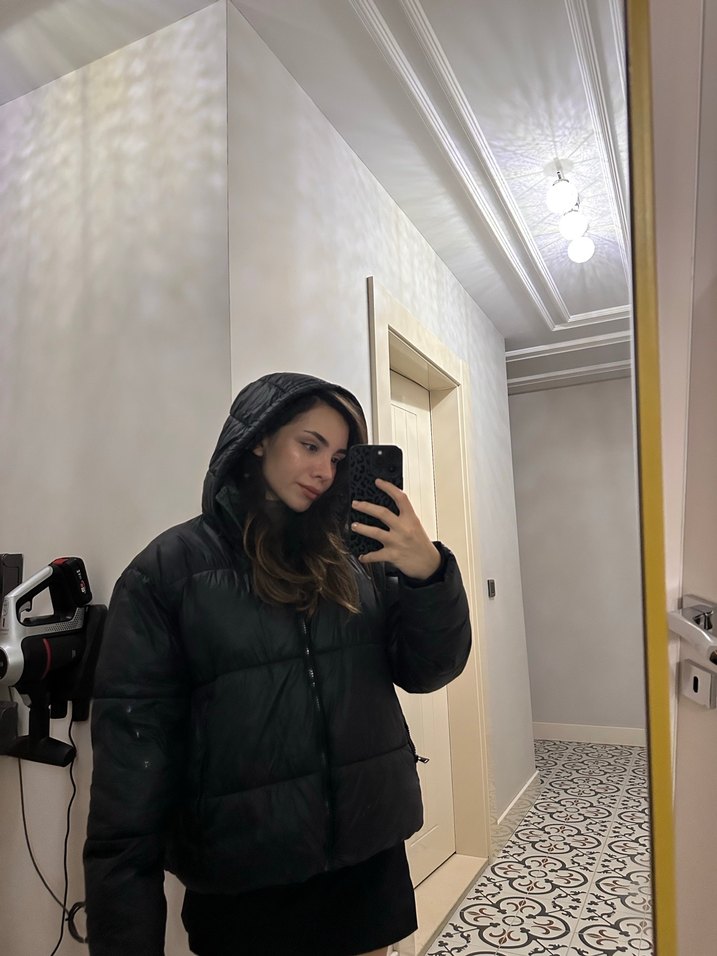 Siyah kapüşonlu kadın mont, şişme ve bol kesimdir. Kusuru yoktur.