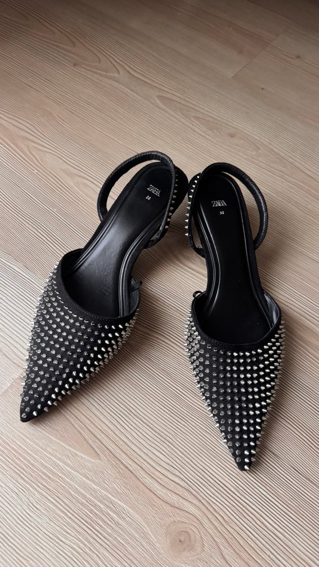 Zara siyah sivri burunlu, zımbalı ve tokalı stiletto, parti için dikkat çekici bir seçim.