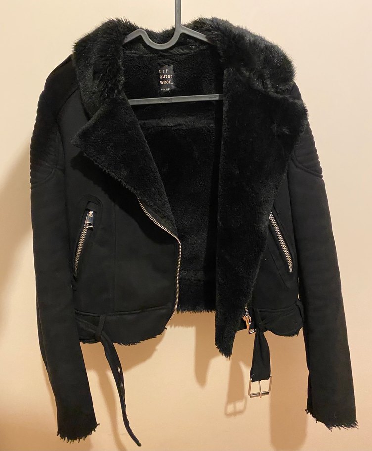 siyah süet biker ceket, kürk detaylı kesik yakası ve askılı kollarıyla rahat ve rock punk tarzını yansıtıyor. Normal midi boy ve fermuarlı ceplere sahip. Herhangi bir kusuru yoktur