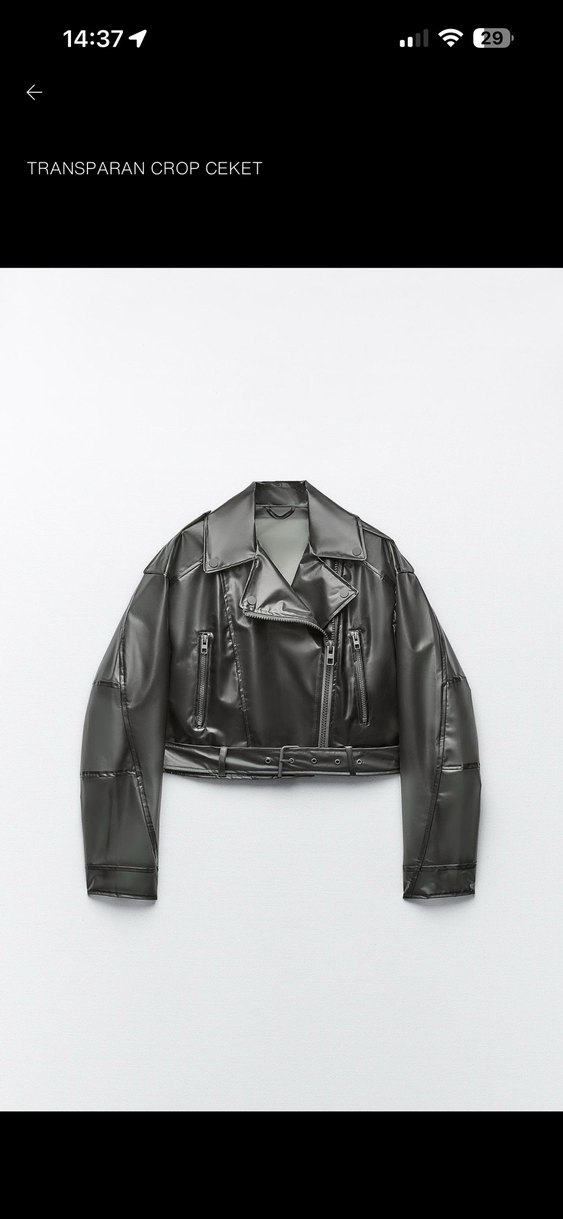 Siyah deri biker ceket, keskin yaka ve askılı kollara sahip. Kemer detaylı, normal kesim ve günlük kullanıma uygun.