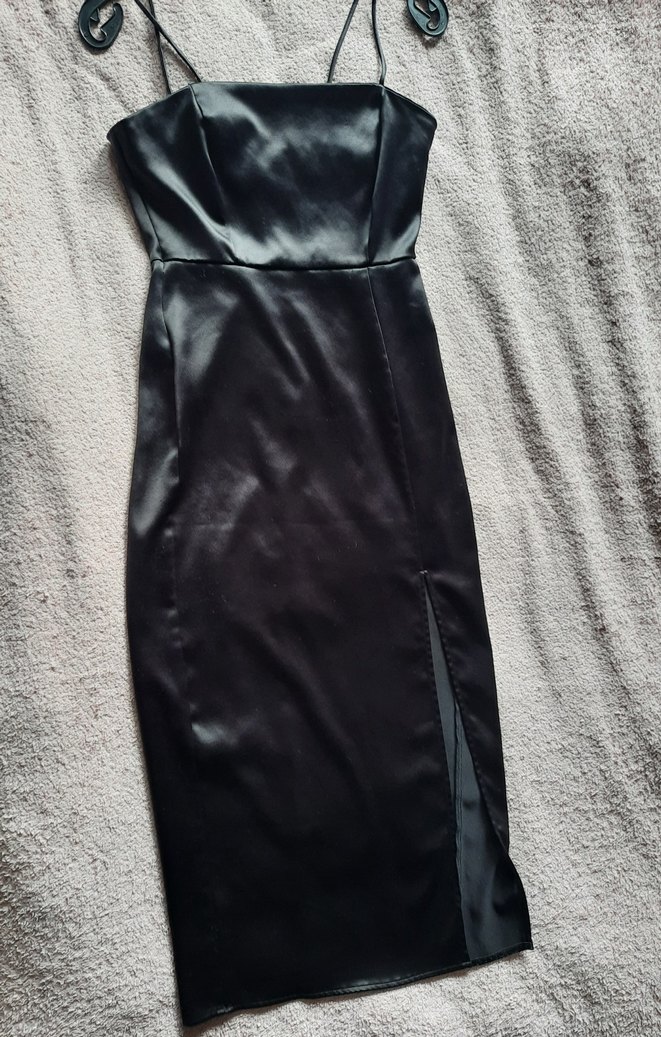 Bu siyah ince askılı, straplez satrn elbise, yırtmaç şık bir görünüm sunar. Romantik akşamlar için ideal. Etiketinde xs yazıyor ama s beden için uygun. Lütfen detaylı inceleyiniz iade kabul etmiyorum