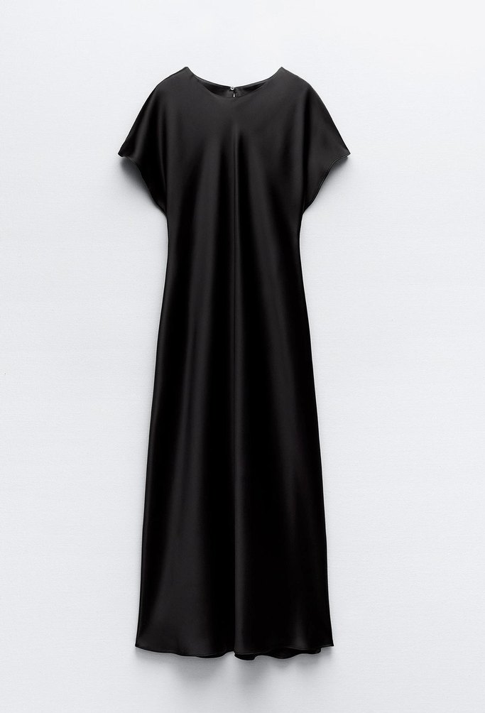 Zara'dan siyah uzun elbise, V yaka ve kısa kollu, dökümlü tasarıma sahip. İpek saten kumaştan, bol kesim, çağdaş ve minimal tarzda. Günlük kullanıma uygun. Belden oturtmalı günlük ve akşam için uygun