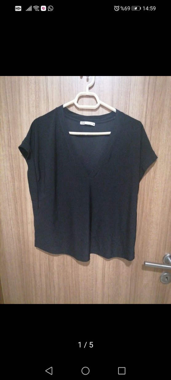 Siyah kumaştan, derin V yakalı ve kısa kollu, bol kesim kadın tişörtü. Minimalist ve zahmetsiz şıklık sunar, gündelik kullanım için uygundur. İç göstermektedir.