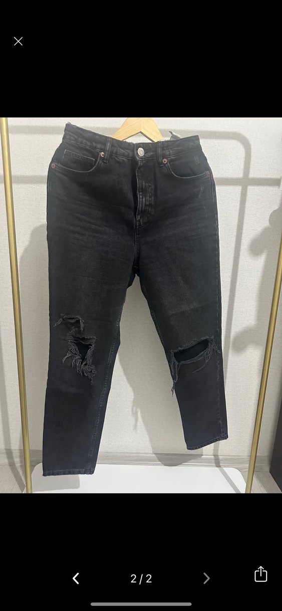 Zara Siyah kot pantolon, bol kesim ve yırtık detaylara sahip. Tokalı bel ve midi boy, gündelik sokak modası için uygun.