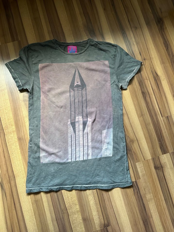 Zara marka small beden Gri denim kumaştan, baskılı desenli, kısa kollu ve dar kesim unıxes tişört,, günlük kullanıma uygun normal boyda.