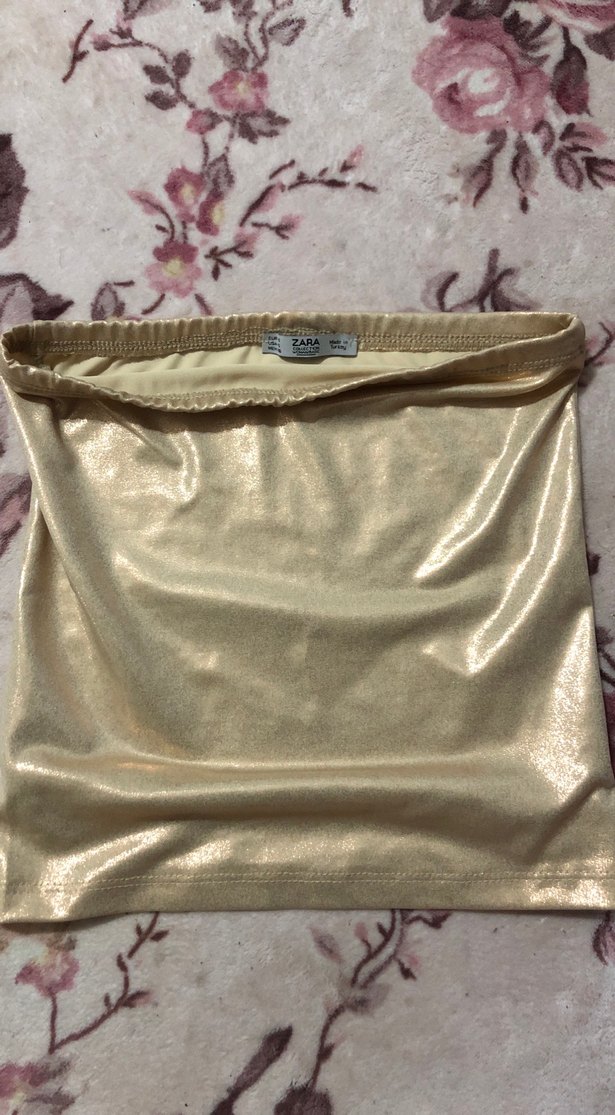 Zara'dan parlak altın renkli, drapeli ve vücuda oturan sentetik mini etek, günlük sokak stili için uygun. ✨