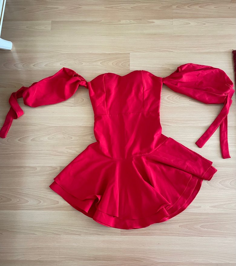 straplez mini elbise. İnce askılı kollar ve volan detaylarıyla dikkat çeker, cesur ve renkli bir görünüme sahiptir.