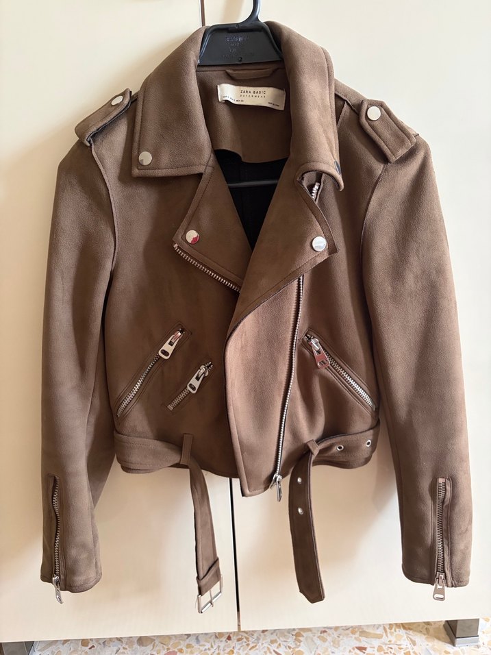 Kahverengi süet deri ceket, fitted kesim ve kesik yakaya sahip. Tokalı detaylar, fermuarlı cepler ve kayışlı kollarla trendy casual tarz sunar. Günlük kullanım için uygun.