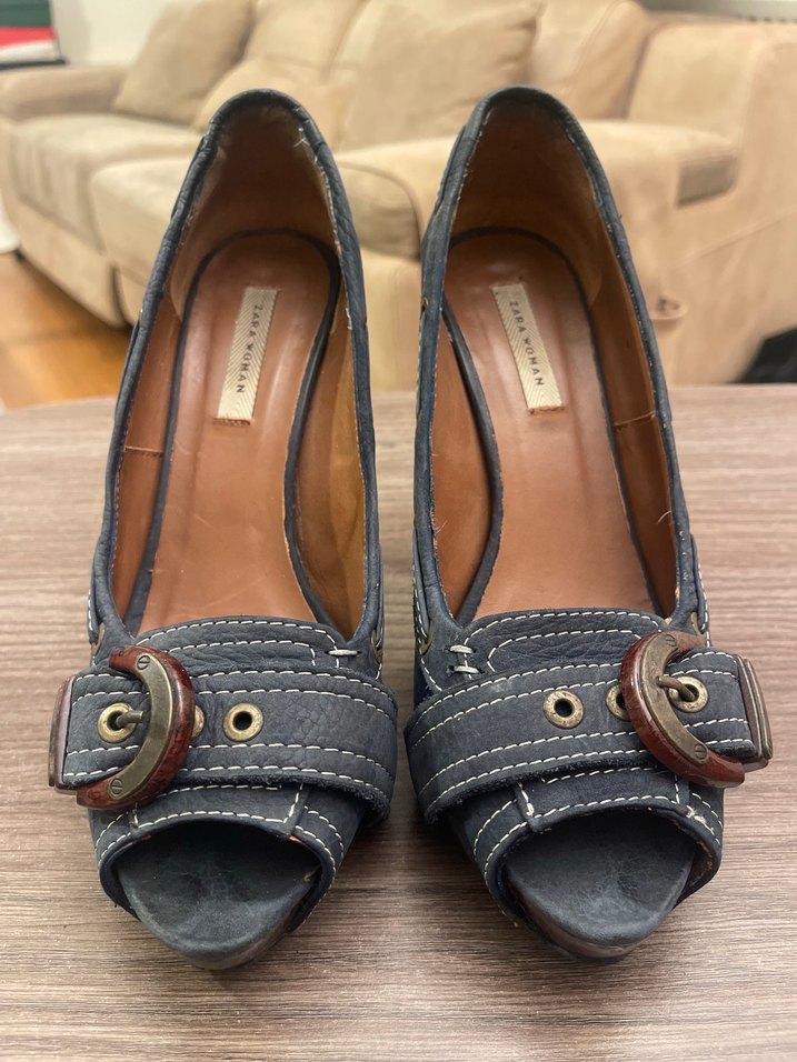 Petrol mavisi hakiki deriden yapılmış, gizli platformlu, açık burunlu ayakkabı. Hakiki deri iç mekan. Topuk, burun ve toka mermer görünümlü lake ahşap görünümlü. Topuk 11 cm iç uzunluk 24 cm ebatlarındadır… ufak tefek de olsa aşınmalar mevcuttur