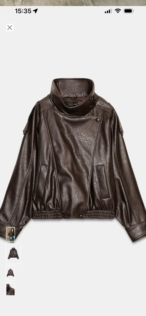 Kahverengi deri biker ceket, yüksek yakalı, askılı uzun kollu ve belden kemerli bol kesimdir. Midi boyu ve desensiz tasarımıyla günlük kullanıma uygundur. Hiç kullanılmadı