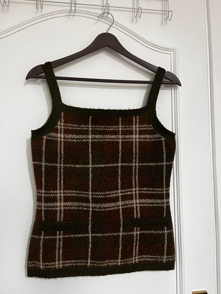 hic giymedim Kahverengi örgü yün kolsuz süveter, normal kesim, kare desenli, düz yakalı ve iki ön cepli.