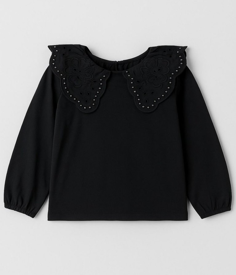 Siyah, uzun kollu, bol kesim Nakışlı fırfırlı yakası ve yumuşak kumaşı bulunur.