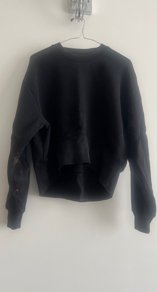 Siyah, yuvarlak yaka ve uzun kollu kadın sweatshirtü. Rahat kesimi ve normal boyu ile gündelik ve sokak stiline uygundur. Kolunda leke var o nedenle fiyat uygun