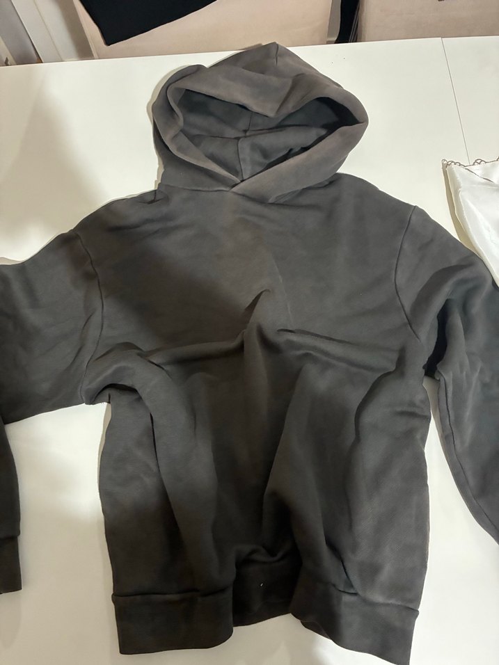 Gri kapüşonlu sweatshirt, uzun kollu ve bol kesimdir. Yumuşak ve sıcak kumaştan üretilmiştir. Desensiz tasarımı sokak ve spor tarzına uygundur.