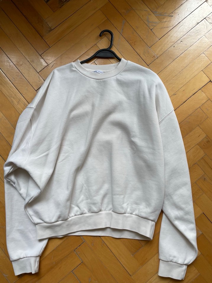 Kadınlar için yuvarlak yakalı, uzun kollu, oversize kesim beyaz keten sweatshirt. Minimalist ve sade tasarımı günlük kullanıma uygundur.