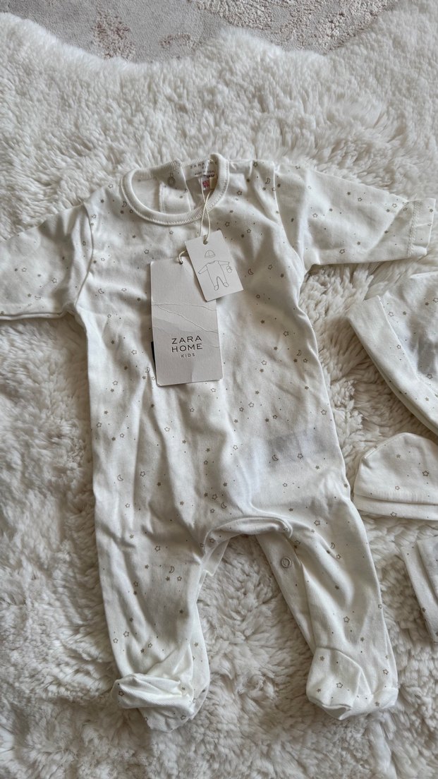 beyaz tulum ve uyumlu şapka ile eldivenlerden oluşan bebek takımı. Yumuşak ve rahat kumaş, bebeğiniz için konfor sağlar.