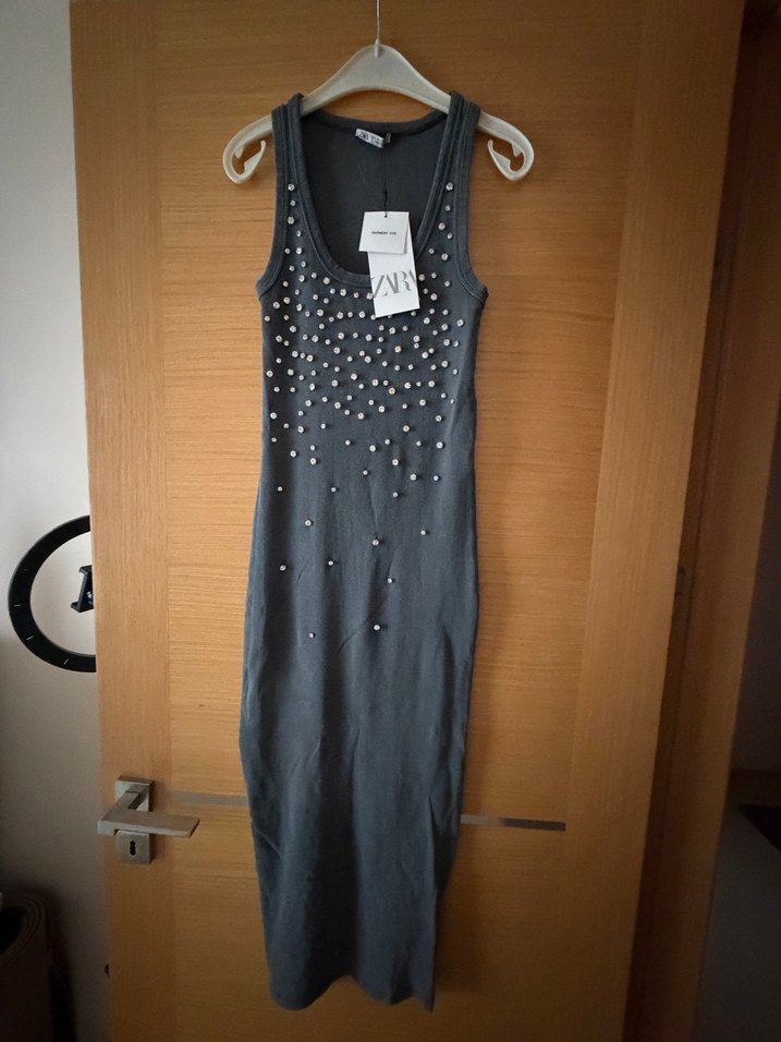 Zara Taş İşlemeli Gri Uzun Kalem Elbise
