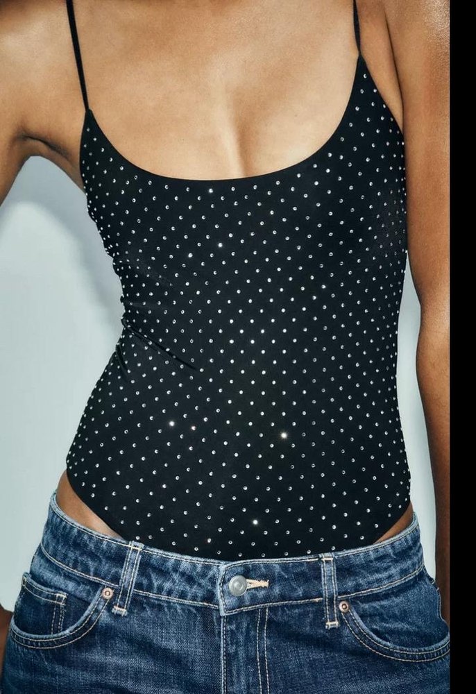 V yaka ve ince askılı, pul payetli puantiyeli siyah denim atlet. Günlük sokak stili için uygun, fit kesim ve cesur tasarım. ✨