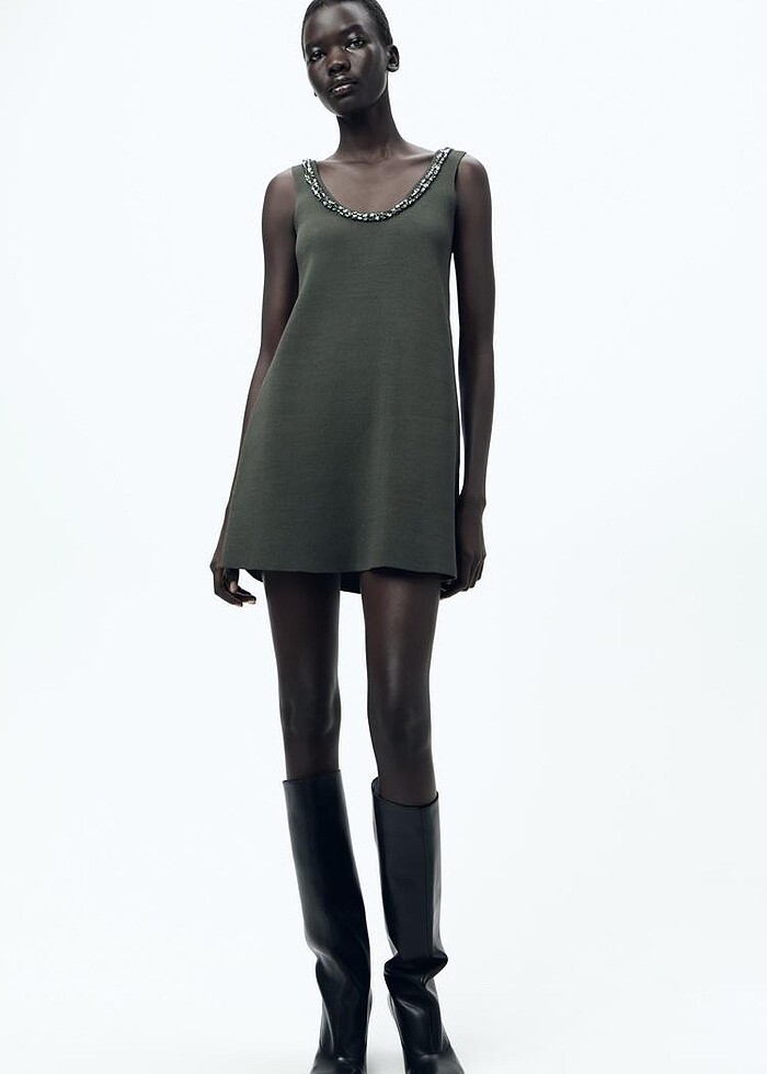 Zara haki yeşili renkli parlak taş boncuklu elbise #yeni#etiketli#zara#haki#yeşili#renkli#taşlı#elbise