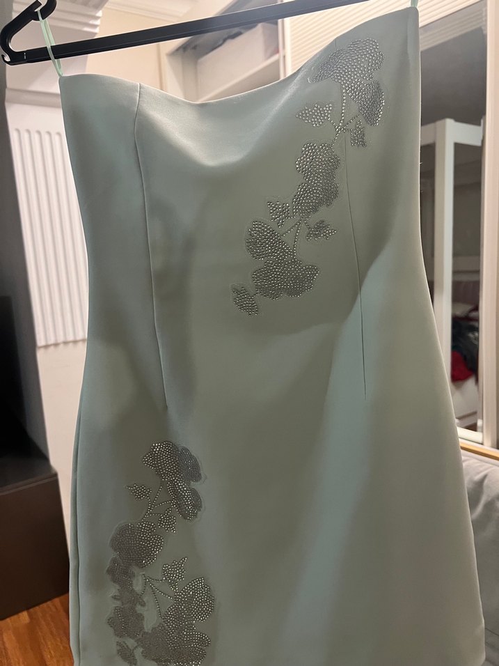Su yeşili renkte uzerinde tas islemeli straplez mini gece elbisesi