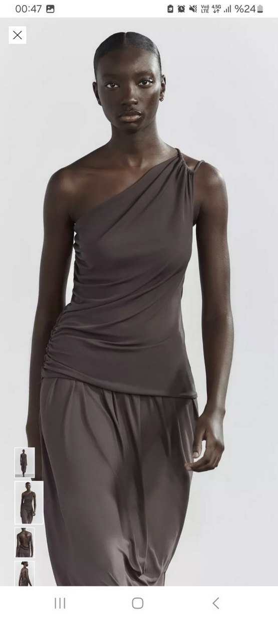 Drapeli, tek omuzlu, kolsuz, günlük kullanıma uygun çağdaş ve minimalist tarz sunar. yeni etiketli zara. rengi göründüğü gibi koyu gri gibi